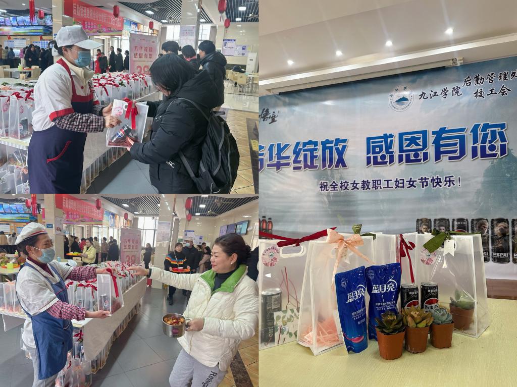 为庆祝第115个"三八"国际劳动妇女节,九江学院后勤管理处联合校工会在食堂开展“芳华绽放感恩有您”主题活动,为节日期间坚守岗位的女教职员工送上节日祝福与暖心福利,传递校园温情。