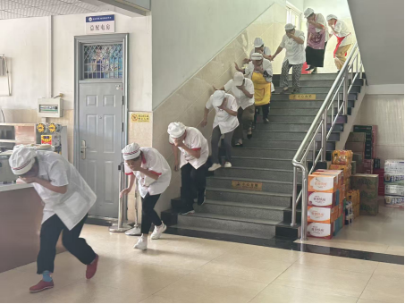 随后进行的应急疏散演练,模拟了食堂后厨发生火情的场景。随着警报声响起,全体员工在安全员的引导下,迅速反应,弯腰低姿、用湿毛巾捂住口鼻,严格按照预定疏散路线,紧张有序地撤离至指定安全区域。整个过程组织严密、行动迅速,达到了演练的预期效果。