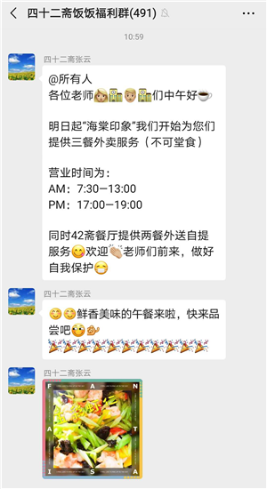 拥有500人的“四十二斋饭饭福利微信群”从2月10日开始恢复了往日的热闹景象,垂涎欲滴的美食图片在11点准时发送,温馨的服务即刻送达。