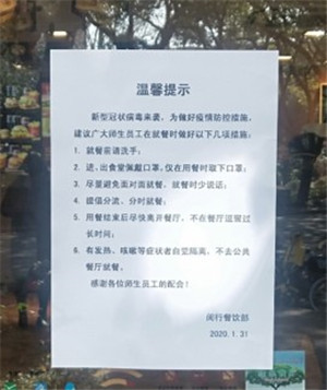 餐饮服务防控,根据餐饮服务工作的特点,第一时间召开防控工作会议,布置防控措施,发布《做好新型冠状病毒感染的肺炎防控工作的通知》,明确各项防控措施,安排专人负责餐饮员工的排查工作,重点关注湖北籍员工的返乡、亲友来访等情况;落实防控物资,在物资紧缺的情况下,采购人员用尽一切办法采购防控所需物资;由专人负责,加强卫生消毒措施,安排卫生专管员负责每日的员工晨检、消毒工作;落实场地、消毒工作(每日2次);加强食品原材料的管控工作,严抓私自采购、严禁购买活禽;扩大人员管理及消毒工作的范围,包括仓库、冷库、公共浴室的消毒,物资配送人员的信息管理、食品原材料配送车辆的消毒等;在餐饮大楼门口张贴温馨提示,提请就餐人员注意做好防控措施;在公共洗手处放置药皂,供就餐人员使用。同时正确对即将出现蔬菜涨价的情况作出预判,及时迅速地落实一大批速冻蔬菜保障餐饮需求,并做好了配送人员补充,为可能出现餐饮配送服务做好准备(需隔离观察的返校学生)等。