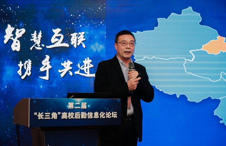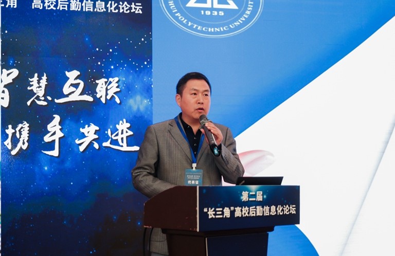 浙江省教育后勤基建协会会长、浙江师范大学副校长潘慧炬致欢迎词,他代表浙江省教育后勤基建协会对本届论坛的举办表示热烈的祝贺。他简要介绍了浙江省的高等教育和高校后勤改革发展的情况。潘慧炬表示,教育现代化需要现代化教育后勤来支撑、作保障,现代化教育后勤必定是高度专业化的、标准化的和智能化的,这也是教育后勤今后发展的方向和必由之路。希望本次论坛能拓宽我们的视野和思路,分享经验和技术,增进友谊和合作,进一步实现“智慧互联、携手共进”,有力推进长三角“三省一市”高校信息化建设,共同为实现教育现代化提供坚强后勤保障。