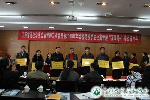 江西省高校高校后勤协会会长、江西中医药大学党委委员、副校长彭映梅致辞,她对参会嘉宾表示热烈欢迎并对该校学生工作、学生公寓管理的理念和管理模式做了详细的介绍,结合国内外宿管先进案例,对我省宿管工作提出了要求和希望。会上省寓专委主任、南昌工程学院学工处处长胡盛华做了2015年度寓专委工作报告,并部署了2016年工作。会议表彰了年度全省高校学生公寓管理先进单位和先进个人以及首届我省“感动公寓人物”,南昌大学、江西师范大学等33所高校被评为全省高校优秀宿管单位,江西财经大学吴珊、南昌工程学院程希泽等95名老师被评为全省高校宿管先进个人,九江学院杨玲、宜春学院钟学红等老师被评为全省“感动公寓人物;会议通报了寓专委财务工作情况。会议由江西省高校寓专委秘书长、江西现代职业技术学院学工处处长李斌艳主持。