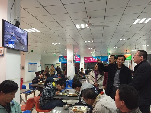 在当天的验收过程中,南工后勤集团总经理童毛弟带领总经理助理张霍胜、餐饮服务事业部副部长邱祥国、物流配送中心主任方莉,先后来到两个食堂,听取了餐饮事业部、施工单位的建设情况汇报,仔细察看了设备安装情况和视频显示情况,对“透明厨房”建设项目给予了一致的肯定。童毛弟总经理还亲切地和就餐学生交流,了解他们对“透明厨房”的看法。在场学生对食堂主动接受监督的做法和这种“高大上”的设施给出了一片点赞声。