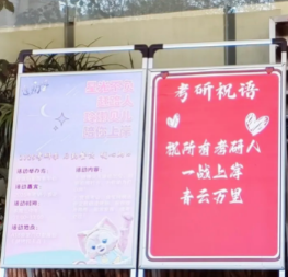 钱塘校区工作人员在A18食堂门口的勤廉园进行了别具心裁的助考活动,许愿墙和留言卡、定胜糕和小烤肠,还有可爱爆棚的“玲娜贝儿”,汇聚了后勤对考研小浪花们的美好祝愿。
