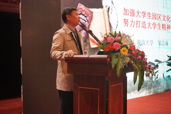 ——湖南省寓专会主任、湖南大学学生园区服务中心邹志成主任以《湖南大学加强大学生园区文化建设,努力打造大学生精神家园》为题做大会发言。