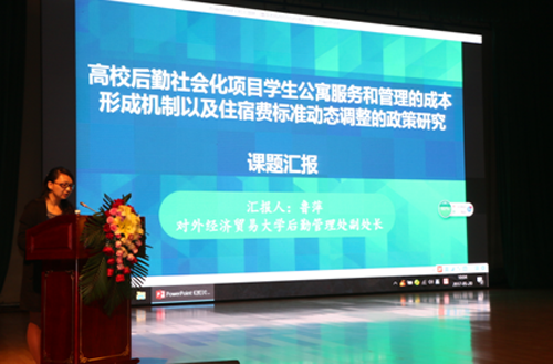 教育部住宿费成本课题主要负责人,北京寓专会副主任、对外经济贸易大学后勤管理处副处长鲁萍汇报教育部住宿费成本课题研究进展情况