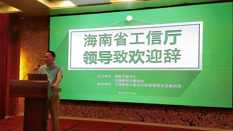 首先,海南省工信厅节能处处长黄福胜代表本次研修班的东道主单位对各位远道而来的领导、专家和学员的到来表示诚挚的感谢与热烈的欢迎。他为大家详细介绍了海南的基本经济情况及在节能领域面临的机遇和挑战。他提出此次研修班为各位学员提供了良好的学习机会,也为海南省高校在教育节能工作方面的成长进步提供了契机。他希望各位节能工作者能够共同配合,为教育节能事业而努力奋斗。