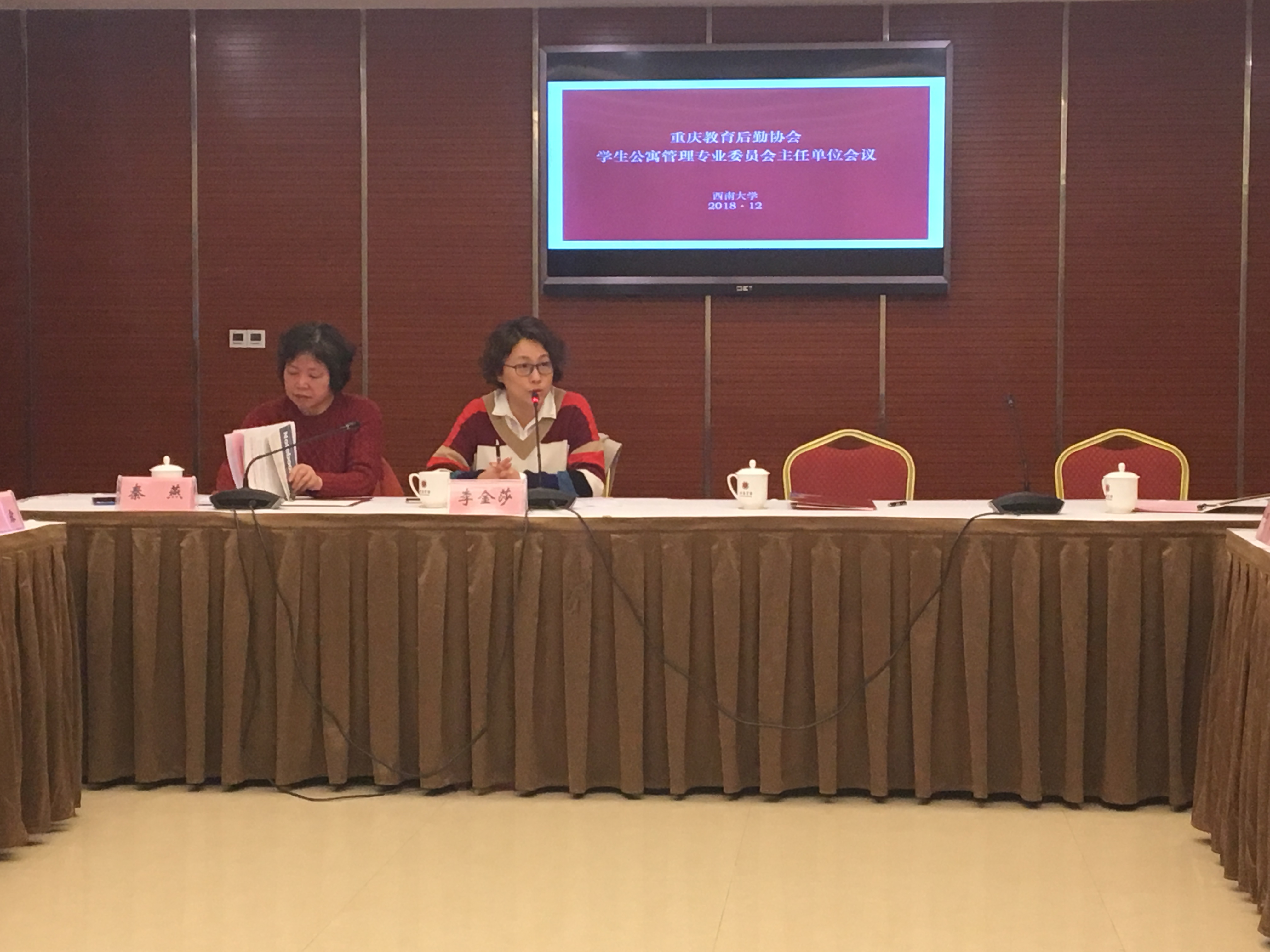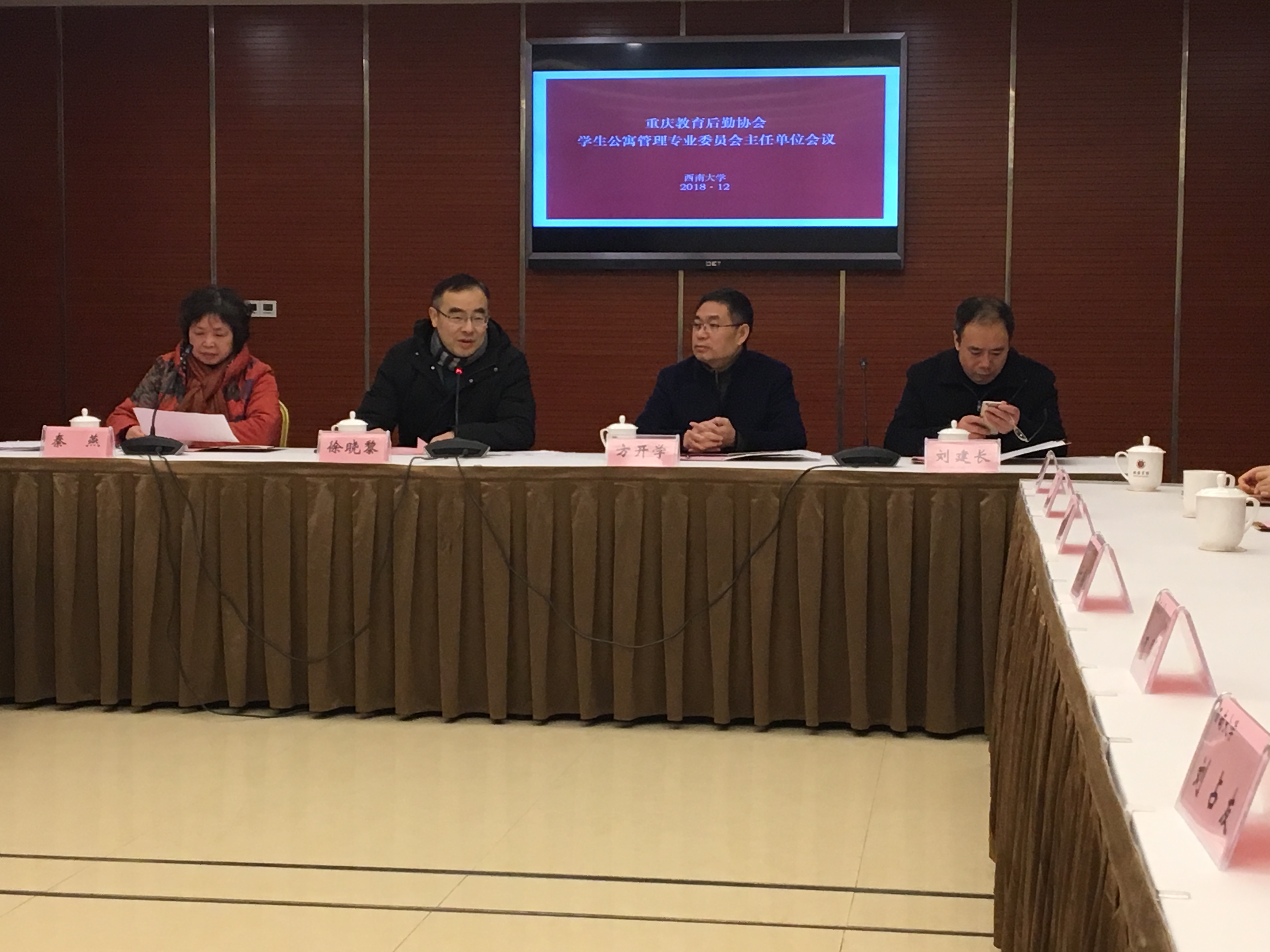 12月12日,重庆教育后勤协会公寓管理专业委员会主任单位工作会议在西南大学召开。重庆教育后勤协会副秘书长李金莎到会,重庆大学、重庆交通大学、重庆邮电大学、长江师范学院、重庆电子工程职业学院五所寓专会副主任单位和西南大学学生宿舍服务中心的13名代表参会。西南大学校党委副书记徐晓黎、后勤集团党委书记刘建长、总经理方开学出席了会议。重庆寓专会主任、西南大学后勤集团原党委书记秦燕主持会议。