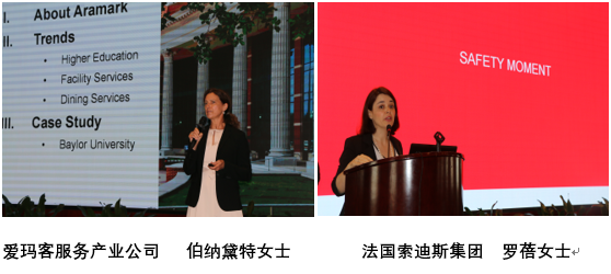 国际著名大学校园服务提供商两大巨头美国的爱玛客和法国的索迪斯总部高管专程到会演讲,为本次论坛增色许多。爱玛客服务产业公司美国教育及医疗增长副总裁伯纳黛特女士通过一个学生一天的校园生活小视频,介绍了美国顶尖大学校园服务管理的理念、模式和技术,她认为,要加强研究,要不断创新,后勤也要产教融合、校企合作;法国索迪斯集团大学部总监