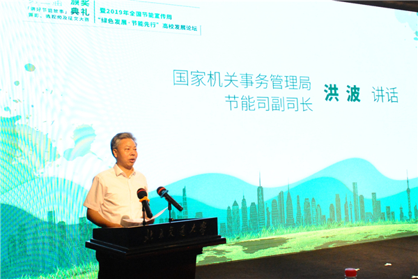国家机关事务管理局节能司洪波副司长出席活动并作讲话。洪副司长表示,公共机构是我国节能工作的一个重要的领域,历来受到各界的重视。党的十八大以来,以绿色发展理念为指引,我国能源资源利用率明显提高,节能降耗取得了新的成效。高校是我国公共机构中重要的一个大类,高校节能的作用和潜力,对全社会节能工作来说意义重大。全国的节能宣传周是国家开展节能宣传最重要的平台和载体,他强调希望通过这个平台,能够为到会的各位代表提供启发,切实推进简约适度、绿色低碳的生活方式。