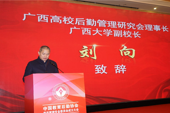 广西高校后勤管理研究会理事长、广西大学副校长刘向代表广西高校致辞。