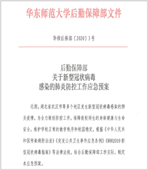 发布防控工作通知。时刻关注疫情发展最新形势,结合后勤保障部实际,制订并发布《关于做好后勤职工新型冠状病毒感染的肺炎疫情防控有关事项的通知》,明确后勤机关、各服务中心和社会企业防控工作的组织领导和工作机制;强化员工进出校园和校内住宿管理,提醒职工不要离开目前的居住地外出旅游或前往疫情发生地,要求确需到校开展管理、服务相关工作的职工,在确保身体状况良好且未离沪、未接触过湖北地区人员的前提下,一律佩戴口罩上岗,并且每日进行不少于2次的体温自测;要求各部门负责人密切关注疫情动态,引导本部门职工正确看待疫情,不信谣、不传谣,树立正确舆论导向。