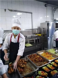 疫情期间的饮食工作繁琐且严谨,作为一名厨师,他既要想方设法为学校隔离区、防疫值班工作人员和留校学生提供营养丰富的一日三餐,又需特别注重疫情期间的饮食安全,从上岗前的体温测量、全身消毒、戴口罩等前序工作,到食品的储存、加工、烹饪等各个重点环节,他都严格把控。