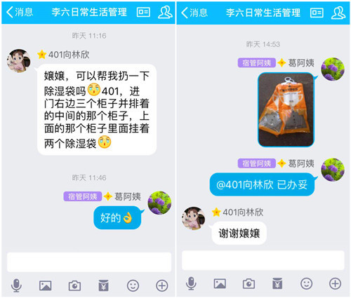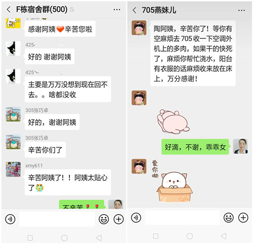 “嬢嬢[1],可以帮我扔一下除湿袋吗?”4月5日晚上11点多,西南大学李园六舍401寝室的向林欣在生活群里呼叫了宿舍管理员葛洪丽。第二天,葛洪丽在群里逐一回复了处理情况,包括向林欣的除湿袋。向林欣说,回家的时候没想到寒假会这么长,寝室很多东西都没有收,只能麻烦阿姨了,“我们嬢嬢特别好,都是主动问我们有没有要帮忙的,宿舍群里天天都很热闹。”