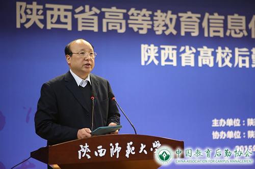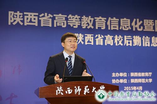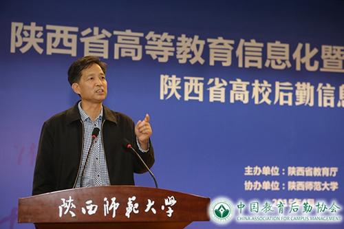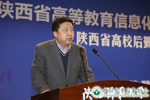 陕西师范大学副校长王武海致辞。他指出,信息化推动教育发展现代化已成为社会发展共识,大力发展后勤信息化有助于提升高校整体服务保障水平,满足不断发展的师生需求。因此需要走出一条科技支持服务、多主体共存、有序竞争的发展道路,希望大家抓住移动互联网发展机遇,互联协作、智慧共享。