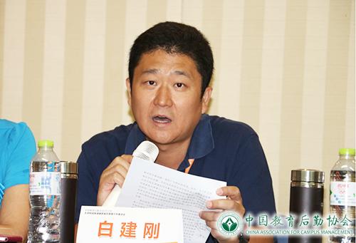 白建刚主任代表广东省教育厅后勤产业办在座谈会上致欢迎辞。他首先转述了来自人民日报微信公众号的一篇题为《国务院发了七个大红包,与你息息相关》的文章,该文提到:国务院要求大力推广电子商务等新兴流通方式,实施“互联网+流通”行动计划,鼓励流通企业发挥线下实体店的物流、服务、体验等优势,推动实体与网络市场融合发展。